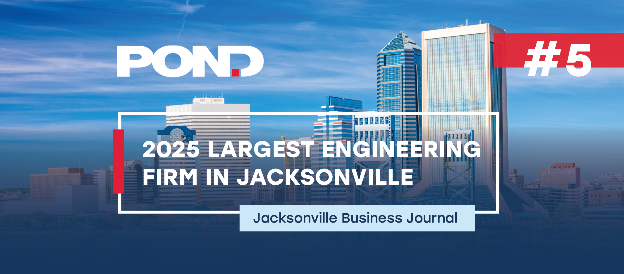 JACKSONVILLE, FL – June 30, 2025 – Pond & Company (“Pond”), an industry leader in engineering, architecture, planning, and construction management services, is proud to be recognized by the Jacksonville Business Journal as one of the First Coast’s largest engineering firms.