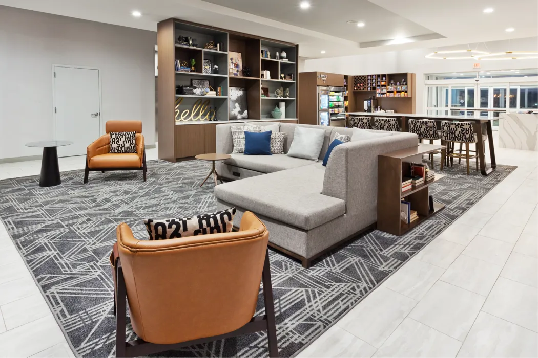 Pond provided interior design services for the Doubletree hotel, located in Dothan, AL. At four stories, the hotel has 100 rooms, a full restaurant, large meeting spaces, and an outdoor resort-style pool. With its timeless and transitional design, the space strikes the balance between sophisticated and comfortable by using clean, geometric forms and neutral materials and colors.